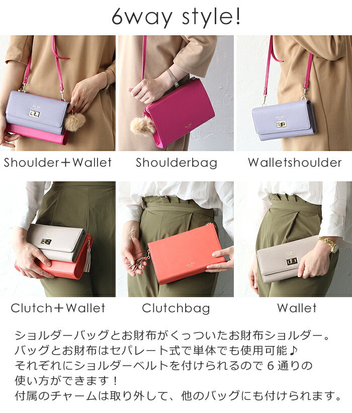 大人らしさとおしゃれな雰囲気を感じさせ、高価なイメージが伝わるような一品です。細部にもロゴの入った上品なデザインとなっています。ショルダーバッグとお財布が一体化したお財布ショルダーで、6WAYのスタイルが可能になります。バッグとお財布はセパレート式なので単体でも使用できますよ。収納部分も充実していて、ポーチやスマホやキーケースもすっぽりと入ります。